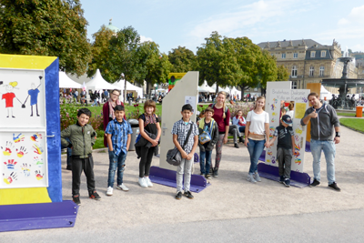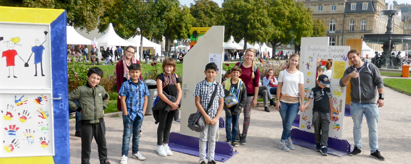 Mitten auf dem Schlossplatz standen aber auch die im Diasporahaus Bietenhausen entstandenen Türen der Gerechtigkeit. Schon seit Monaten wurde in den Wohngruppen, Tagesgruppen, Klassen und Diensten an den Türen gearbeitet. Die Diakonie hatte bundesweit zu einer Kampagne unter dem Motto „Türen öffnen Gerechtigkeit leben“ aufgerufen. Es sollten Türen gestaltet werden, die das Engagement der Diakonie für Gerechtigkeit zum Ausdruck bringen. Kinder, Jugendliche und Erwachsene unserer Einrichtung haben ihre Gedanken zur Gerechtigkeit in der Gestaltung der Türen zum Ausdruck gebracht und konnten sie jetzt mit Stolz auf dem Schlossplatz der Landeshauptstadt betrachten. Viele unserer Wohn- und Tagesgruppen aus Hechingen, Balingen, Albstadt und Meßstetten hatten sich auf den Weg gemacht und ihrer Türen in Stuttgart bewundert. Das war einmalig. Auf dem Schlossplatz konnte man immer wieder Kindern, Jugendlichen und Mitarbeitern aus dem Diasporahaus begegnen. Alle waren dabei bei 500 Jahre Reformation und kehrten mit eindrücklichen Erlebnissen nach Hause zurück.