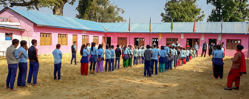 Nach ungefähr drei Stunden kamen wir im überschaubaren Lurpung an. Dort gingen wir direkt zur Schule, da eine kleine Begrüßungsfeier bereits auf uns wartete. Die Kinder bildeten zwei Reihen und wir durften mit unseren frischen und gutaussehenden Blumenketten hindurchgehen, während wir noch mit weiteren Blumen beworfen wurden. In der Schule trafen wir auch eine Reisegruppe von unserem Kooperationspartner himal Spezialreisen, die Lurpung zum Abschluss besuchten. Hierbei hatten wir auch die Möglichkeit, den Mitbegründer dieser Schule kennenzulernen und von ihm aus erster Hand zu erfahren, was sich in den ganzen Jahren zuvor schon verbessert hat.