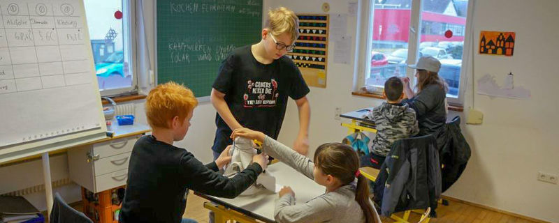 Paul Hanke und Maurice Pieger nehmen beim Kultusministerium an der Ausbildung zu Umweltmentoren teil. Die Ausbildung umfasst zwei dreitägige Einheiten, mit anschließenden Praxisphasen an den Schulen zu den Themen "Klimaschutz" und "Erneuerbare Energien". Die Jugendlichen verbessern in ihren Klassen die Energiebilanz, mit Hilfe eines umfassenden Energiechecks. Ein paar praktische Punkte sind: das Licht beim Verlassen des Raumes löschen, Stoßlüften und die Heizung nicht auf das Maximum aufdrehen, während daneben das Fenster offen steht.